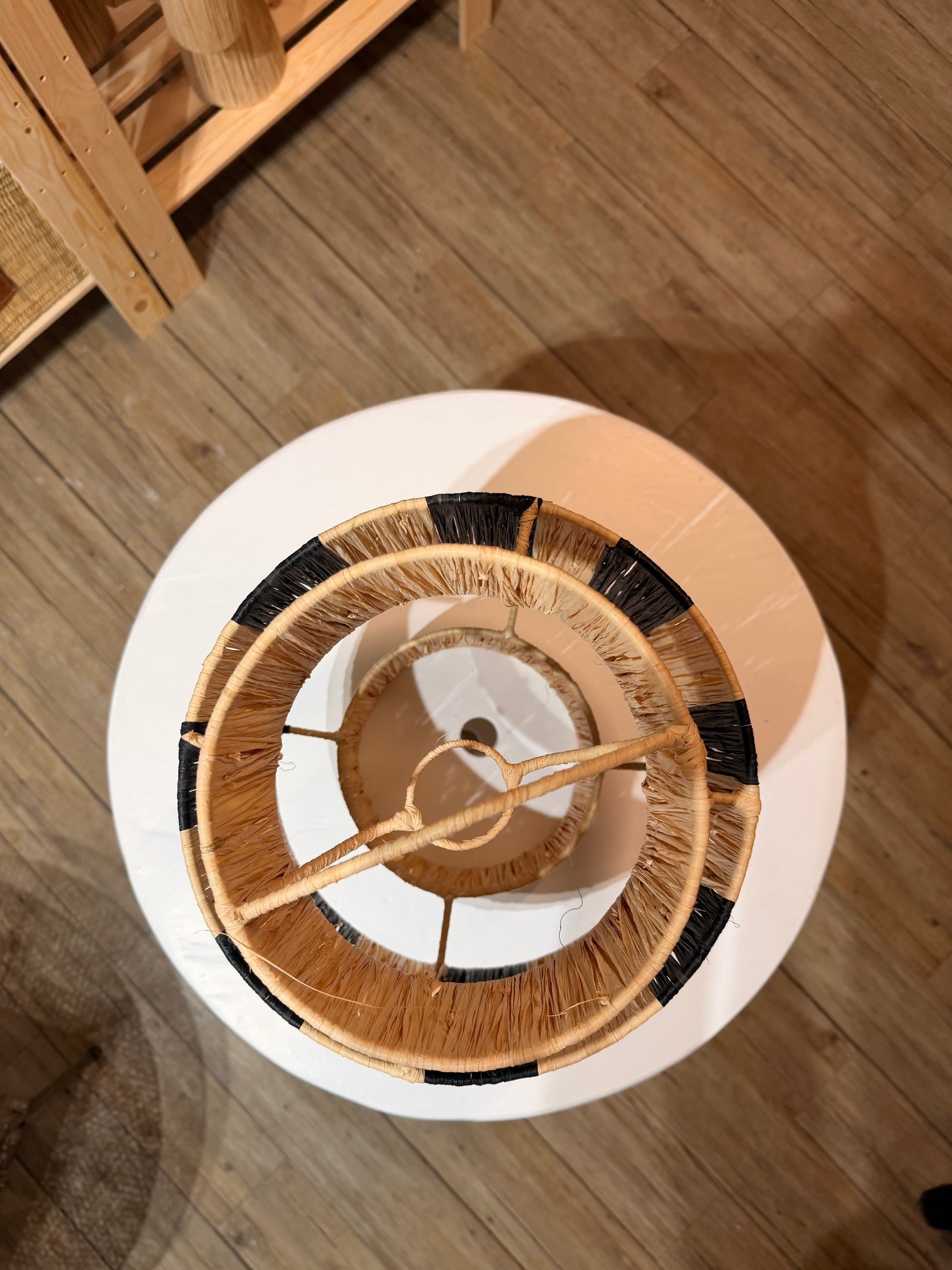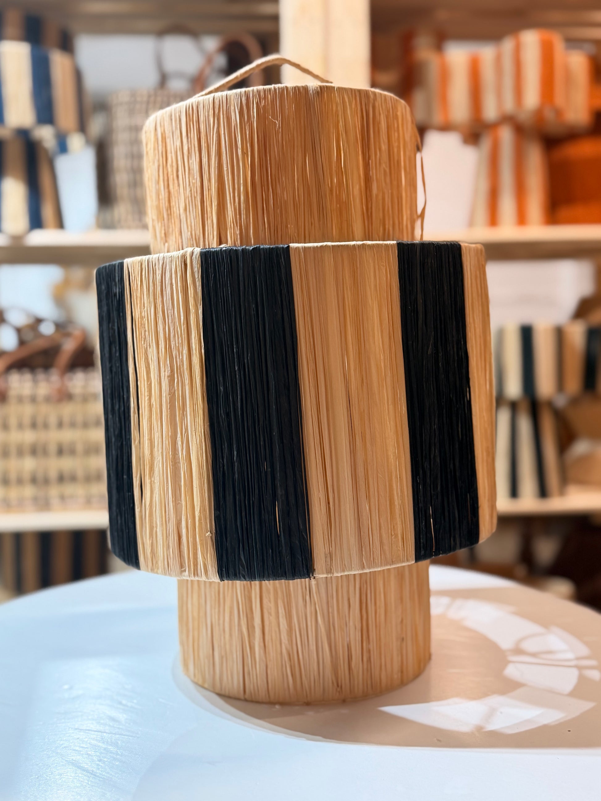 Lampara de rafia natural combinada con detalles en negro, tejida artesanalmente. Su diseño geométrico y contrastado aporta un aire sofisticado.